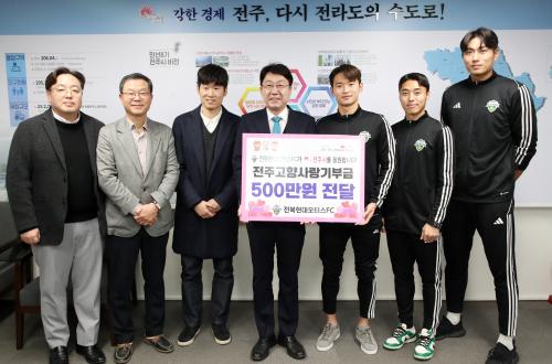 À̳¯ ½ÃûÀ» ãÀº ÁÖÀå È«Á¤È£ ¼±¼ö µî ÀüºÏÇö´ë¸ðÅͽºFC ¼±¼öµéÀº ÆÀÀÇ ¿¬°íÁöÀÎ ÀüÁֽà ¹ßÀüÀ» À§ÇÑ ÀÀ¿øÀÇ ¸Þ½ÃÁö¸¦ ´ã¾Æ 500¸¸ ¿øÀÇ °íÇâ»ç¶û±âºÎ±ÝÀ» ±âŹÇϱ⵵ Çß´Ù.