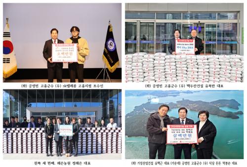 22ÀÏ °íÈﱺ¿¡ µû¸£¸é ¡ãskÅÚ·¹ÄÞ °íÈïÁöÁ¡ Á÷¿ø(Á¶¼öÀÎ) 300¸¸ ¿ø ¡ã¹ý¹«ºÎ û¼Ò³â ¹üÁË¿¹¹æ °íÈïÁö±¸ ȸÀå(Á¶±¤¿µ) 200¸¸ ¿ø ¡ã´ëÁ¤ÀÌ¿£¾¾(´ëÇ¥ ±è³²¿) 200¸¸ ¿ø ¡ã¹éµÎ»ê°Ç¼³ (´ëÇ¥ À¯º¹¸¸) ¹é¹Ì 10kg 200Æ÷(500¸¸ ¿ø »ó´ç) ¡ã¿À¼º°ÇÃàÀÚÀç(´ëÇ¥ Á¶½Â±â) ÄíŰ¡¤¿À¶õ´Ù °úÀÚ °¢ 100°³(590¸¸ ¿ø »ó´ç) ¡ãÇýÀº³ó¿ø(´ëÇ¥ Á¤ÇýÀº) ¹«±èÄ¡ 900kg°ú ±èÀå¿ë »ý¹« 3Åæ(700¸¸ ¿ø »ó´ç) ¡ã°Å¼º»ê¾÷°Ç¼³(´ëÇ¥ À¯¹é±Ù)°ú ½Ä´ç µ·µ·(´ëÇ¥ ¹ÚºÀ¼ø) 300¸¸ ¿øÀ» ±âŹÇß´Ù°í ÀüÇß´Ù.