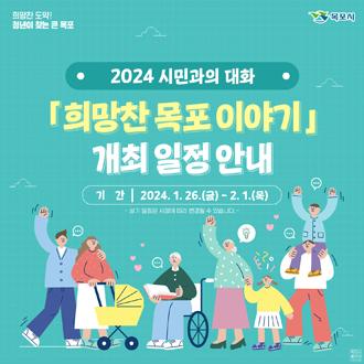 ÇÑÆí, ½Ã´Â 2024³âµµ ½Ã¹Î°úÀÇ ´ëÈ ¼¼ºÎÀÏÁ¤À» ¾È³»ÇÏ°í »çÁ¤¿¡ µû¶ó °³ÃÖ ³¯Â¥¿Í ½Ã°£, Àå¼Ò°¡ º¯°æµÉ ¼ö ÀÖ´Ù°í ÀüÇß´Ù. ¡ã1ÀÏÂ÷ 1¿ù 26ÀÏ(±Ý) ¿¹¼ú¿þµùÄÁº¥¼Ç 6Ãþ(¿ë´ç1µ¿, ¿ë´ç2µ¿, ¿¬µ¿, »ïÇе¿, À̷ε¿, Çϴ絿)¡ã2ÀÏÂ÷ 1¿ù29ÀÏ(¿ù) ¸ñÆ÷¼öÇù(»êÁ¤µ¿, ´ë¼ºµ¿, Á×±³µ¿, ºÏÇ×µ¿, ¸ñ¿øµ¿, µ¿¸íµ¿, ¸¸È£µ¿, À¯´Þµ¿) ¡ã3ÀÏÂ÷ 1¿ù30ÀÏ(È) ¸ñÆ÷Á¾ÇÕ»çȸº¹Áö°ü±³À°°ü(¿¬»êµ¿, ¿ø»êµ¿, ¿ëÇØµ¿) ¡ã4ÀÏÂ÷ 1¿ù31ÀÏ(¼ö) ¿¡¸Þ¶öµå¿þµùȦ(»óµ¿, »ïÇ⵿, ¿Á¾Ïµ¿) ¡ã5ÀÏÂ÷ 2¿ù1ÀÏ(¸ñ) ¼§±×¸®¾ÆºñġȣÅÚ(½ÅÈﵿ, ºÎÈﵿ, ºÎÁÖµ¿)
