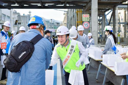 ƯÈ÷ ´ëÁ¤ºñ ±Ù·ÎÀÚ Ãâ±Ù½Ã°£¿¡ ¸ÂÃç ¾ÆÄ§ 7½Ã20ºÐºÎÅÍ ½ÃÀÛµÈ Ä·ÆäÀο¡¼ Âü¿©ÀÚµéÀº ±Ù·ÎÀÚ¿¡°Ô È«º¸¹°À» ¹èºÎÇÏ¸ç ¾ÈÀü±¸È£¸¦ Á¦Ã¢ÇÏ´Â µî »ç¾÷Àå ±Ù·ÎÀÚ ¾ÈÀüÀÇ½Ä °íÃë¿¡ Èû½è´Ù.