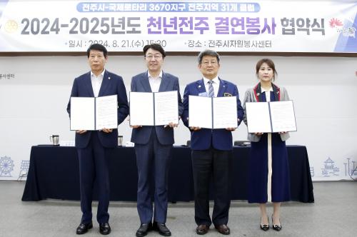 ÀüÁÖ½Ã¿Í ±¹Á¦·ÎŸ¸® 3670Áö±¸´Â 21ÀÏ ÀüÁÖ½ÃÀÚ¿øºÀ»ç¼¾ÅÍ¿¡¼ ¿ì¹ü±â ÀüÁÖ½ÃÀå°ú ³²°ü¿ì ÀüÁÖ½ÃÀÇȸ ÀÇÀå, ÀÌÁö¿ø ±¹Á¦·ÎŸ¸®3670Áö±¸ ÃÑÀç, À̴뼺 ·ÎŸ¸® ÀçÀüÇùÀÇȸ ÀÇÀå, ÀüÁÖÁö¿ª 31°³ ·ÎŸ¸®Å¬·´ °ü°èÀÚ, µ¿ Áֹμ¾ÅÍ °ü°èÀÚ µî 70¿© ¸íÀÌ Âü¼®ÇÑ °¡¿îµ¥ ¡®2024-2025³âµµ õ³âÀüÁÖ °á¿¬ºÀ»ç Çù¾à½Ä¡¯À» °¡Á³´Ù.