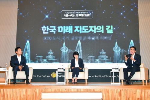[ºÎ»ê]ºÎ»ê½Ã(½ÃÀå ¹ÚÇüÁØ)´Â 23ÀÏ ¿ÀÀü 10½Ã µ¿¼´ëÇб³ ¼¾ÅÒÄ·ÆÛ½º¿¡¼ Çѱ¹Á¤Ä¡ÇÐȸ ÁÖ°ü Ưº° ´ë´ãÀ» ÅëÇØ ºÎ»ê°ú ¼¿ïÀÇ ¸®´õµéÀÌ <Çѱ¹ ¹Ì·¡ ÁöµµÀÚÀÇ ±æ-2030 µµ½Ã, ±¹°¡, ±Û·Î¹ú ¹®Á¦ ±Øº¹ ¸®´õ½Ê>À̶ó´Â ÁÖÁ¦·Î ´ëÇѹα¹ÀÌ Á÷¸éÇÑ ¹®Á¦¿Í ±× ÇØ¹ý¿¡ ´ëÇØ ¸ð»öÇÏ´Â ½Ã°£À» °¡Á³´Ù°í ¹àÇû´Ù.