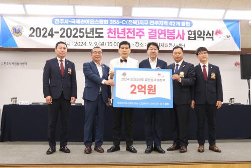 ÀüÁÖ½Ã¿Í ±¹Á¦¶óÀ̿½ºÇùȸ 356-C(ÀüºÏ)Áö±¸´Â 9ÀÏ ÀüÁÖ½ÃÀÚ¿øºÀ»ç¼¾ÅÍ¿¡¼ ¿ì¹ü±â ÀüÁÖ½ÃÀå°ú ÃÖÁÖ¸¸ ÀüÁÖ½ÃÀÇȸ ºÎÀÇÀå, Á¤±âÁ¤ ±¹Á¦¶óÀ̿½ºÇùȸ 356-C(ÀüºÏ)Áö±¸ ÃÑÀç, ÀüÁÖ1¡¤2¡¤3¡¤4Áö¿ª ºÎÃÑÀç, ÀüÁÖÁö¿ª 42°³ ¶óÀ̿½ºÅ¬·´ ȸÀå, 35°³ µ¿ Áֹμ¾ÅÍ µ¿Àå µî 100¿© ¸íÀÌ Âü¼®ÇÑ °¡¿îµ¥ ¡®2024-2025³âµµ õ³âÀüÁÖ °á¿¬ºÀ»ç Çù¾à½Ä¡¯À» °¡Á³´Ù.