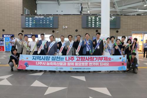 À̳¯ À±º´Å ³ªÁÖ½ÃÀå°ú ³óÇùÁß¾Óȸ ³ªÁÖ½ÃÁöºÎ ½Å°æÈÆ ÁöºÎÀåÀ» ºñ·ÔÇÑ Áö¿ª ³óÇù °ü°èÀÚµéÀÌ Âü¼®ÇØ ³ªÁÖ ½Ò°ú ¹èÁóÀÌ ´ã±ä ¼±¹° ²Ù·¯¹Ì¸¦ ±Í¼º°´µé¿¡°Ô ³ª´²ÁÖ¸é¼ °íÇâ»ç¶û±âºÎÁ¦ÀÇ ÃëÁö¿Í ÇýÅÃÀ» ¾Ë·È´Ù.