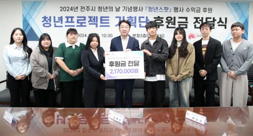 ÀüÁֽô 16ÀÏ ½Ãû 3Ãþ ȸÀǽǿ¡¼ ¿ì¹ü±â ÀüÁÖ½ÃÀå°ú À̺´È£ (Àç)ÀüÁÖ½ÃÀÎÀçÀ°¼ºÀç´Ü ÀÌ»çÀå, û³âÇÁ·ÎÁ§Æ® ±âȹ´Ü ¼Ò¼Ó û³â µîÀÌ Âü¼®ÇÑ °¡¿îµ¥ ¡®2024 ÀüÁֽà û³âÀdz¯ ±â³äÇà»ç ¼öÀÍ±Ý Àü´Þ½Ä¡¯À» °¡Á³´Ù.