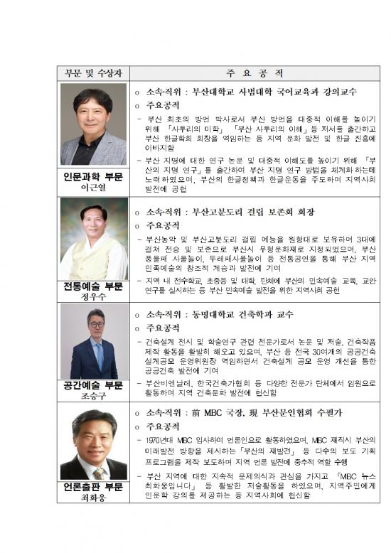 ¼ö»óÀÚ´Â ÃÑ 4°³ ºÎ¹® 4¸íÀ¸·Î, ¡ãÀι®°úÇÐ ºÎ¹®, À̱ٿ ºÎ»ê´ëÇб³ ±¹¾î±³À°Çаú °ÀDZ³¼ö ¡ãÀüÅ뿹¼ú ºÎ¹®, Á¤¿ì¼ö ºÎ»ê°íºÐµµ¸® °É¸³ º¸Á¸È¸ ȸÀå ¡ã°ø°£¿¹¼ú ºÎ¹®, Á¶½Â±¸ µ¿¸í´ëÇб³ °ÇÃàÇаú ±³¼ö ¡ã¾ð·ÐÃâÆÇ ºÎ¹®, ÃÖÈ¿õ Àü(îñ) ºÎ»ê¹®È¹æ¼Û(MBC) ±¹ÀåÀÌ ¼±Á¤µÆ´Ù.