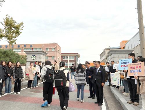 ¿µ±¤±º °ü°èÀÚ´Â ½ÃÇèÀå¿¡ µé¾î°¡´Â Çлý ÇѸí ÇÑ¸í¿¡°Ô ¡°¼öÇè»ý ¿©·¯ºÐ Èû³»¼¼¿ä.¡±¶ó´Â ÀÀ¿øÀÇ ¸Þ½ÃÁö¿Í °Ý·ÁÀÇ ¹Ú¼ö¸¦ º¸³Â°í, ½ÃÇèÀåÀ» ÁغñÇÑ ±³Á÷¿ø°ú ÀÚ³àÀÇ ¹è¿õÀ» À§ÇØ ÇÔ²² ¿Â Çкθðµé¿¡°Ôµµ ¡°¿©·¯ºÐÀÇ Çå½Å°ú Áö¿ø ´öºÐ¿¡ ÇлýµéÀÌ À̹ø ¼ö´ÉÀ» ¹«»çÈ÷ Ä¡¸¦ ¼ö ÀÖ´Ù.¡±¶ó¸ç °¨»çÀÇ Àλ縦 ÀüÇß´Ù.