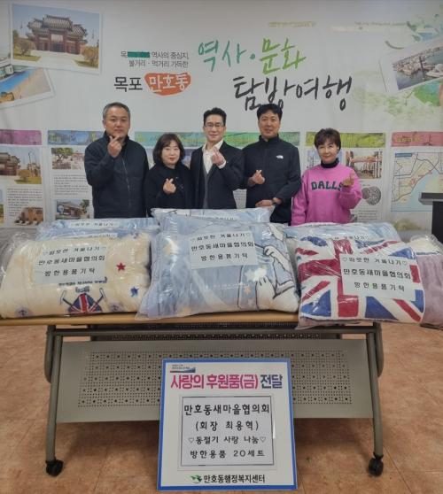 ¸¸È£µ¿»õ¸¶À»ÇùÀÇȸ´Â ƯȻç¾÷ ÀÏȯÀ¸·Î µ¿Àý±â¸¦ ¸Â¾Æ ÃßÀ§¿¡ ¾î·Á¿òÀ» °Þ´Â ¾î¸£½Å°ú û¼Ò³âµé¿¡°Ô °Ü¿ï¿ë Á¶³¢, ³»ÀÇ, ¸ðÀÚ, Àå°©, ´ã¿ä µîÀ¸·Î ±¸¼ºµÈ ¹æÇÑ¿ëǰ 20¼¼Æ®¸¦ Á÷Á¢ Àü´ÞÇÏ¸ç ¾ÈºÎ¸¦ »ìÆñ´Ù.