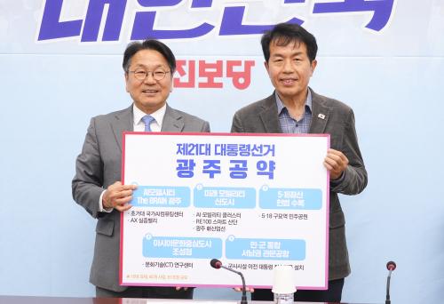 °±âÁ¤ ±¤ÁÖ±¤¿ª½ÃÀåÀÌ 17ÀÏ ±¹È¸¿¡¼ Áøº¸´ç À±Á¾¿À »óÀÓ´ëÇ¥ Á÷¹«´ëÇà °â ¿ø³»´ëÇ¥¿Í ÀüÁ¾´ö ¿ø³»ºÎ´ëÇ¥, ÀåÁø¼÷ Á¤Ã¥À§ÀÇÀå µîÀ» ¸¸³ª ±¤Áֽà ´ë¼±°ø¾àÀÎ ¡®±¤ÁÖÀÇ Á¦¾È¡¯À» ¼³¸íÇϰí ÀÖ´Ù.