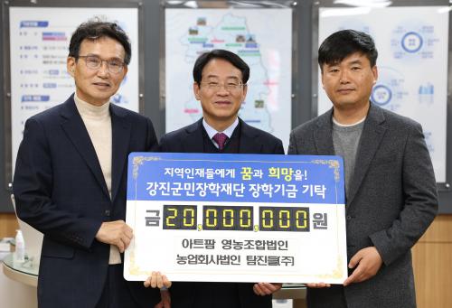 °Áø±º¹ÎÀåÇÐÀç´Ü¿¡ ¿¬¸»¿¬½Ã µû¶æÇÏ°í ¼ÒÁßÇÑ ±âŹ Çà·ÄÀÌ À̾îÁö°í ÀÖ´Â °¡¿îµ¥, ±è±ÔÇÏ ¾ÆÆ®ÆÊ ¿µµ¿Á¶ÇÕ¹ýÀÎ ´ëÇ¥ 1õ¸¸ ¿ø, ¸íµ¿ÁÖ ³ó¾÷ȸ»ç¹ýÀΠŽÁøµé(ÁÖ) ´ëÇ¥ 1õ¸¸¿ø, ±èÁ¤¹è ¾ç¸íÀÚ¿¬³óÀå ´ëÇ¥ 3¹é¸¸ ¿ø, ¾ç¿µ½Ä ´Ù¿ÍÄ«Æä ´ëÇ¥ 1¹é¸¸ ¿ø, °Áø±ºÃ» ±è¿Õ¼® ÁÖ¹«°üÀÌ 30¸¸ ¿øÀÇ ÀåÇбÝÀ» °Áø±º¹ÎÀåÇÐÀç´Ü(°Áø¿ø)¿¡ ±âŹ Çß´Ù.